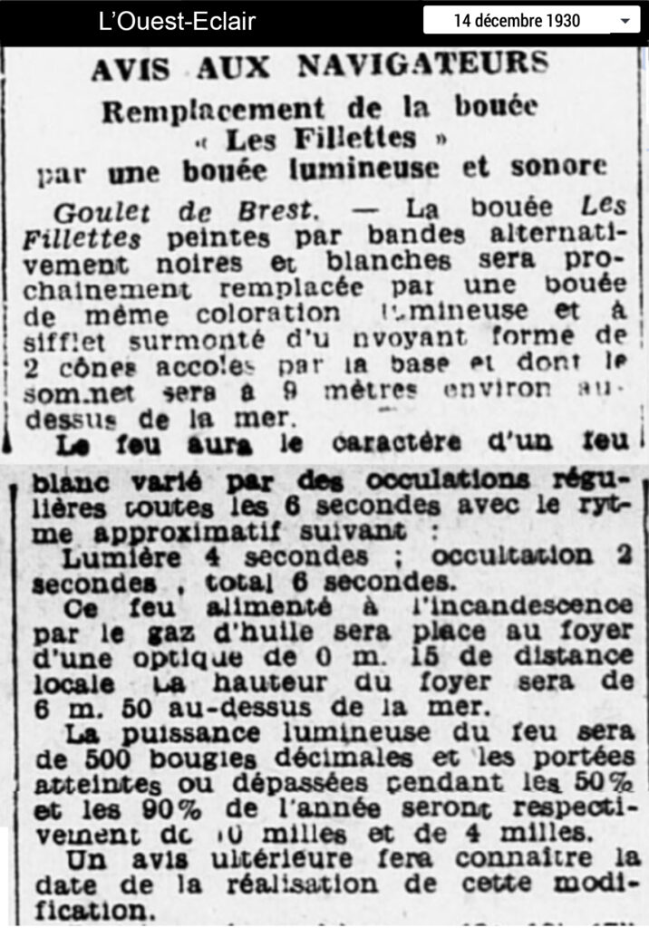 C’est à la fin de l’année 1930 où, tout début 1931 que le plateau des Fillettes fut balisé par une bouée sonore actionnée par la houle. Un avis aux navigateurs fut publié dans la presse pour en informer tous les capitaines de navires et marins chenalant vers le port de Brest.