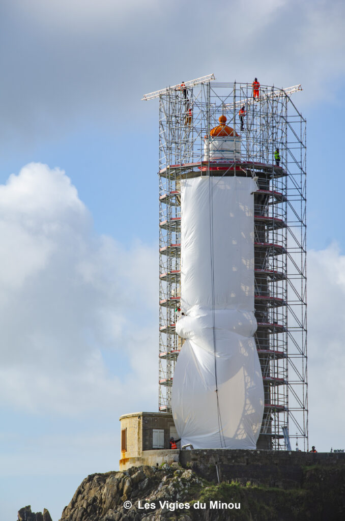 A chaque marée haute, éclaboussant copieusement au passage les équipes occupées à construire le grand échafaudage, les vagues explosent au pied du phare. S’engouffrant dans des grandes orgues dissonantes, désaccordées, le vent siffle dans les tubes métalliques dressés vers le ciel. Des tourbillons ivres escaladent les passerelles construites jusqu’à trente mètres de haut. Les bâches destinées à protéger le phare, bordées comme un grand spinnaker claquent au vent.