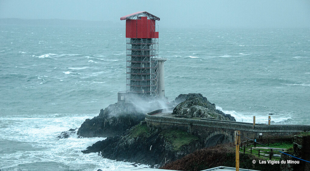 Il y a quelques jours, nous partagions sur la page Facebook de l’association, des photographies de la Pointe du Petit Minou affrontant la neuvième tempête de l’année! Nous ne sommes que mi-février. Les coups de vent d’hiver se succèdent à un rythme soutenu sur le chantier du phare en cour de restauration.